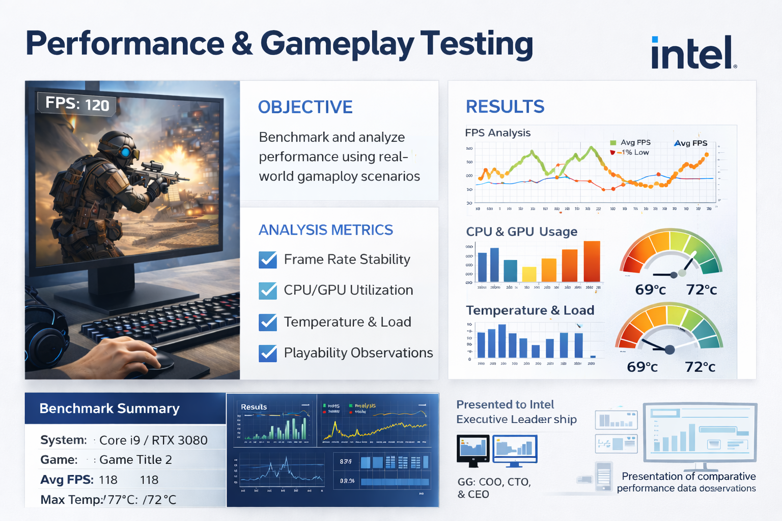 I ran structured gameplay and performance benchmarks across multiple Intel PC hardware configurations, following internal testing protocols and pushing each system in real-world scenarios. Using popular AAA titles, I evaluated frame rate stability, load times, thermal behavior, and overall playability across different builds.